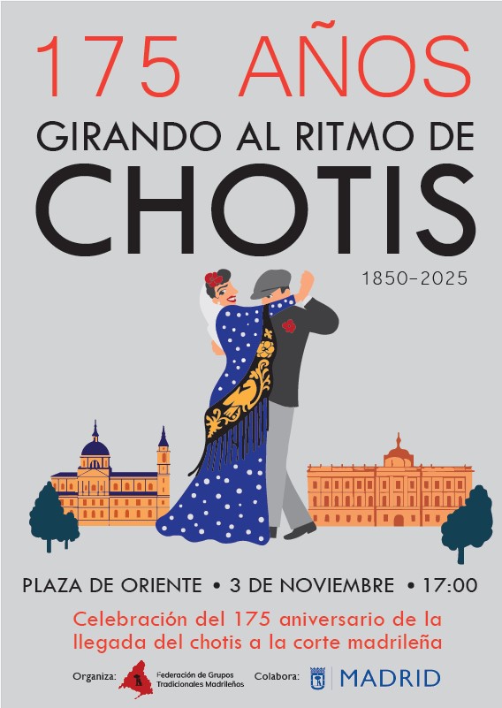 Con motivo de la conmemoración del 175 aniversario del primer chotis que se bailó en Madrid frente a Isabel II en el Palacio Real el 3 de noviembre de 1850, os invitamos a participar en el acto que celebraremos el próximo lunes 3 de noviembre a las 17.00 horas en la Plaza de Oriente.