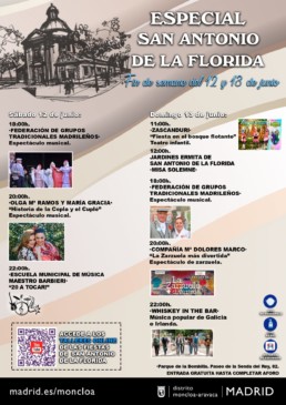 con la participación y actuación de las Agrupaciones Castellanas, Goyescas y Castizas Madrileñas que interpretarán sus bailes y canciones más populares de las fiestas de Madrid, Seguidillas, Jotas, Chotis, Pasodobles, Zarzuelas y Goyescos.