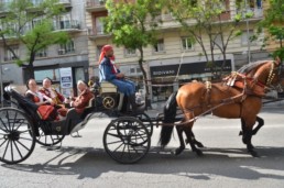 Este mismo dia por la tarde socios de las distintas agrupaciones, vestidos con sus trajes goyescos se pasean en calesa para asistir a la Corrida de Toros Goyesca del “Dos de mayo”, en la Plaza Monumental de Las Ventas.